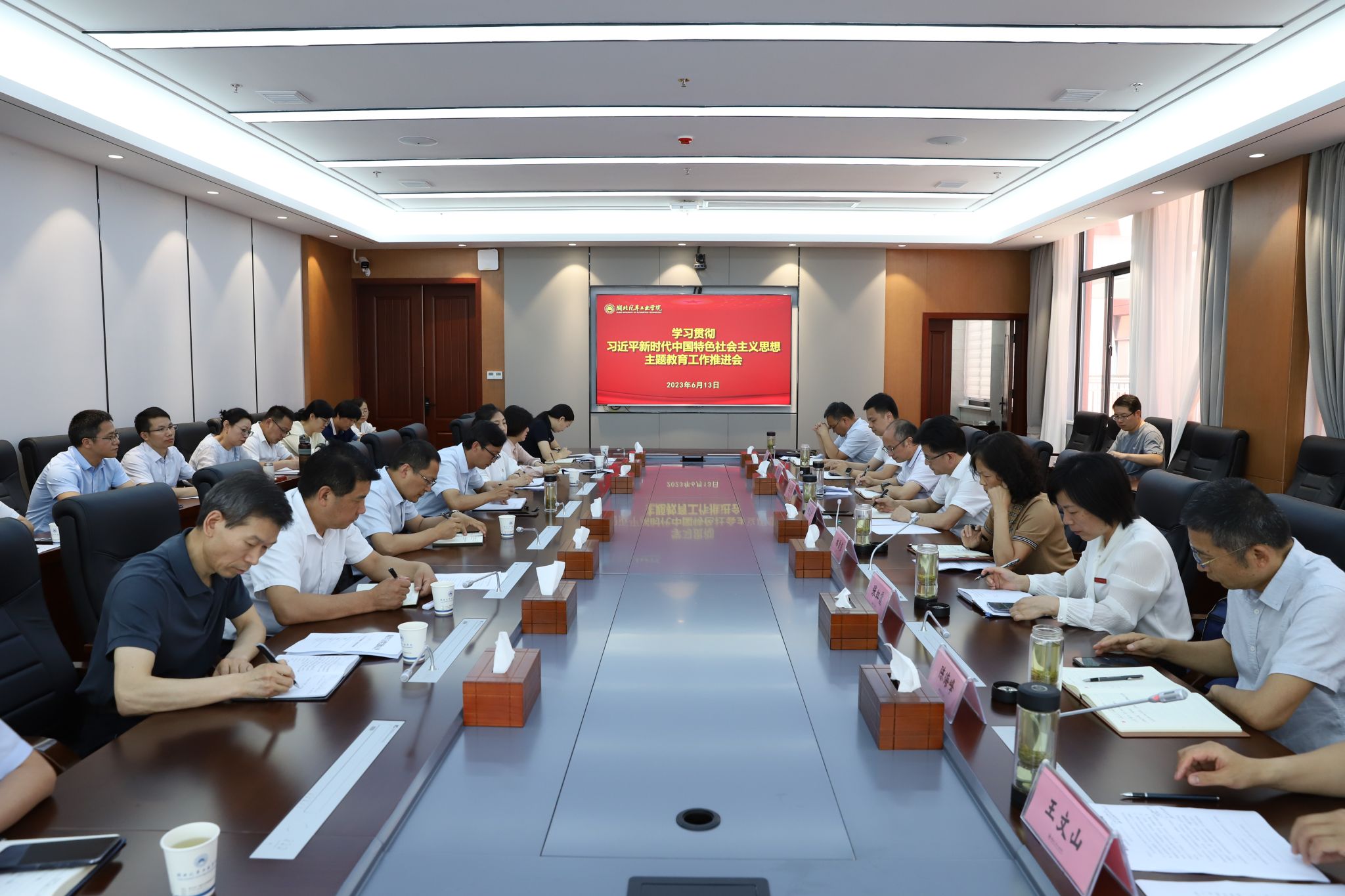 本网讯(文 广娟/图 邓玉洁)6月13日下午,学校在产教大楼三楼多功能会议室召开学习贯彻习近平新时代中国特色社会主义思想主题教育推进会,深入贯彻中央和省委有关精神,研究部署下一步重点工作,校党委书记张文学就从深从实推进主题教育提要求。全体在家校领导出席会议,党委常委、党政办主任王文山主持会议。